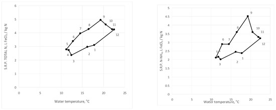 A strong relationship between water temperature and bacterial activity, expressed by nitrogen removal when adding FeCl3, was also observed (Figure 6, right OY axis).