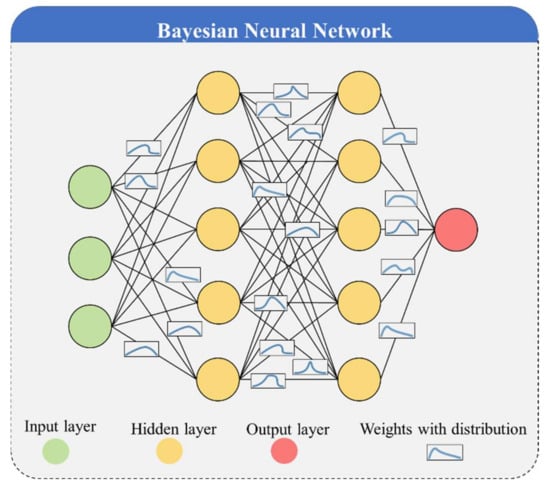 Given the input data, and their corresponding output labels . The primary goal of the Bayesian approach is to identify the parameter of a function that probably generates the desired output [,]. In this approach, a prior distribution that represents the prior belief about the neural network parameter distribution before observing the inputs is employed over W to capture epistemic uncertainty. The Bayesian neural network structure is illustrated in Figure 1. Rather than a single network, this method trains a set of networks in which the weight of each network is derived from a shared learning probability distribution [].