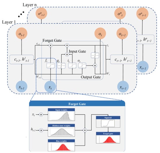 where denotes the number of training samples. An example of the Bayesian LSTM cell of the proposed BLSTM network is shown in Figure 2, with a zoomed-in plot of the forget gate at time step t in the first layer.