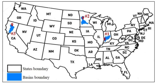The study basins were located in different climate regions of three states across the United States, i.e., IN (Indiana), MN (Minnesota), and CA (California). Figure 3 shows the locations of the three basins. The first case study was conducted in Bartholomew County, IN, the second was conducted in Koochiching County, MN, and third was conducted in Shasta County, CA. The drainage area of the river basins was approximately 1560–4420 km2.