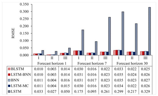 To further evaluate the results of the four probabilistic models for all scenarios in the three case studies, LSTM as a well-known deterministic model was used to make a comparison in terms of RMSE, as shown in Figure 4. All probabilistic models in all horizons performed well and provided more accurate prediction performance in terms of RMSE than the deterministic LSTM, indicating the superiority of all probabilistic models in comparison with the conventional deterministic model. The range of RMSE indicated that all models were fairly trained, and they showed promising predictability performance in terms of RMSE.