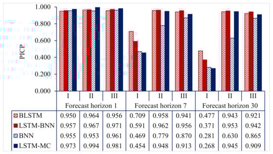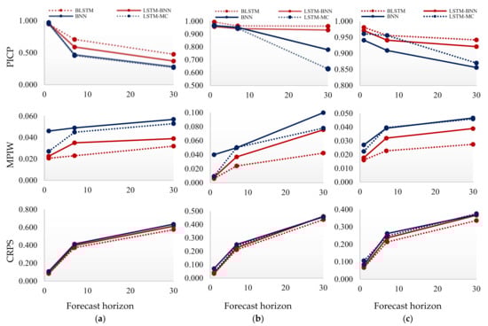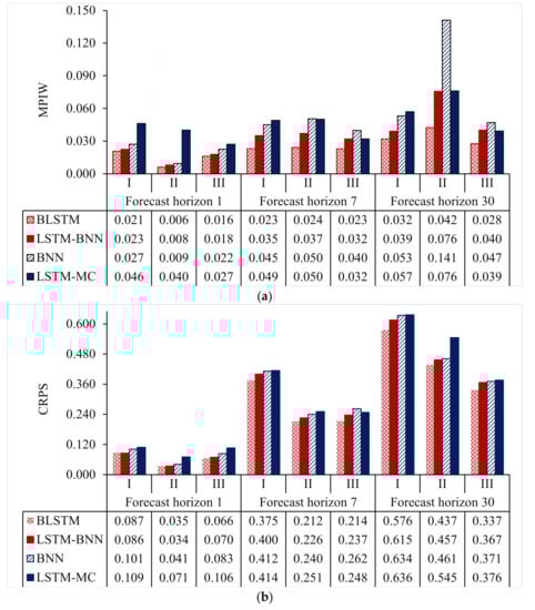 The MPIW values of the four models during the test period are shown in Figure 6a. The MPIW was considered an effective representation of sharpness in probabilistic predictions, and referred to the concentration of the predictive distributions. The more concentrated the predictive distributions, the lower the MPIW, the sharper the prediction, and consequently the better the predictive performance. As shown in Figure 6a, BLSTM has the lowest MPIW, which indicates that it is the sharpest predictive model among the other models in all scenarios. The stand-alone BNN and LSTM-MC were slightly different, whereas the LSTM-MC obtained the highest MPIW value among the other models, particularly by increasing the horizon. Compared with the BLSTM model with the narrowest MPIW, LSTM-MC had the worst prediction sharpness over all horizons. The fact that BLSTM presents the best predictive capability indicates the significance of capturing both epistemic and aleatoric uncertainties.