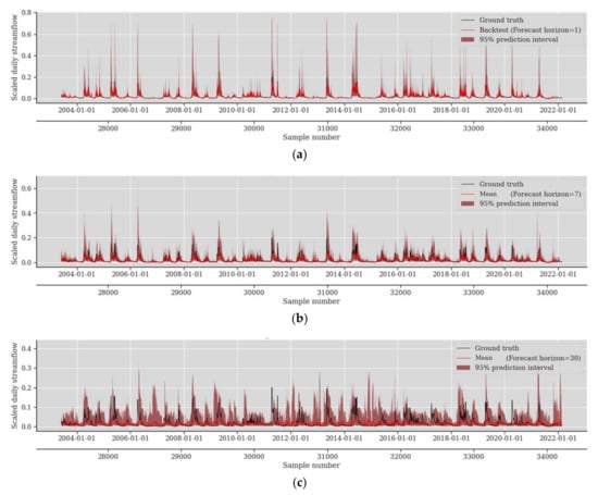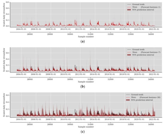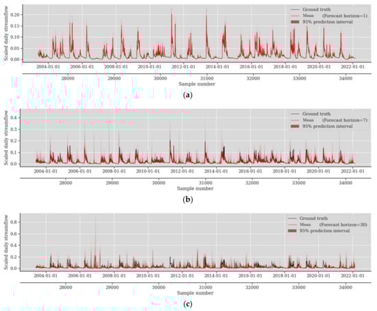 Probabilistic streamflow forecasting results obtained by LSTM-BNN for case study II for (a) forecast horizon 1, (b) forecast horizon 7, and (c) forecast horizon 30.