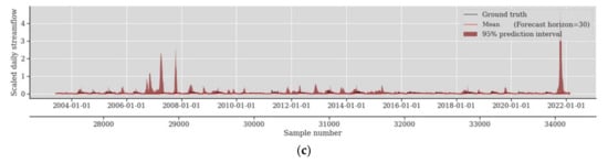Deep learning (DL), a sophisticated and mathematically complex evolution of machine learning (ML) algorithms, has recently received huge attention from researchers and has gradually become the most widely used forecasting approach in hydrology [,,,,]. The advantage of DL is its flexibility to learn massive data and the ease of incorporating exogenous covariates []. The advantages of DL techniques over traditional ML algorithms for streamflow forecasting have been discussed in many studies [,]. However, DL has not been extensively explored in forecasting uncertainty.