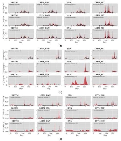For a better and more vivid comparison of all model performances, the time series of all models for all case studies in the three scenarios are shown in Figure 12a–c for the first year of the test period (365 days). We observed that BNN and LSTM-MC underestimated the peak flows with a misleading trend in the first 365 days. In the first scenario, a 95% PI was relatively narrow and constant for all models, indicating that models captured both low and high flow values appropriately with low uncertainty. However, longer horizons in Scenarios II and III were associated with a wider 95% PI, indicating greater model uncertainty.