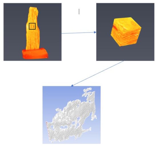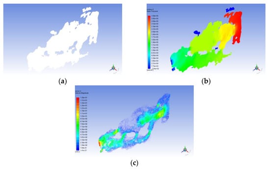 The CT images are image processed, and 3D reconstructed to obtain a 3D pore model. After processing the model with Median Filtering and the threshold splitting binarization method, the appropriate fissure extraction was selected in the cropped model by AVIZO software (as shown in Figure 2). The cropped section is 150 × 150 × 150 voxels in size, and the sample contains a full fissure. After extracting the fissures, the surface of the fissures is smoothed, the entrance and exit of the fissures and the boundary conditions are set, the intersections are repaired, the number of faces is simplified so as to improve the quality of the mesh, and finally, a triangular mesh is generated on the surface of the fissures. After the meshing is completed, the quality of the mesh is checked, and low-quality, unconnected meshes are removed to ensure that a high-quality mesh is generated and finally saved as a cas format file, which is then imported into FLUENT software for the next numerical simulation.