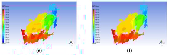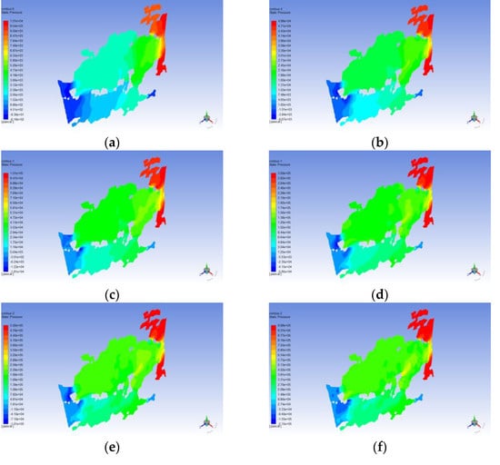 z negative inlet pressure cloud map: (a) 0.1 Mpa pressure cloud map. (b) 0.5 Mpa pressure cloud map. (c) 1 Mpa pressure cloud map. (d) 3 Mpa pressure cloud map. (e) 5 Mpa pressure cloud map. (f) 10 Mpa pressure cloud map.