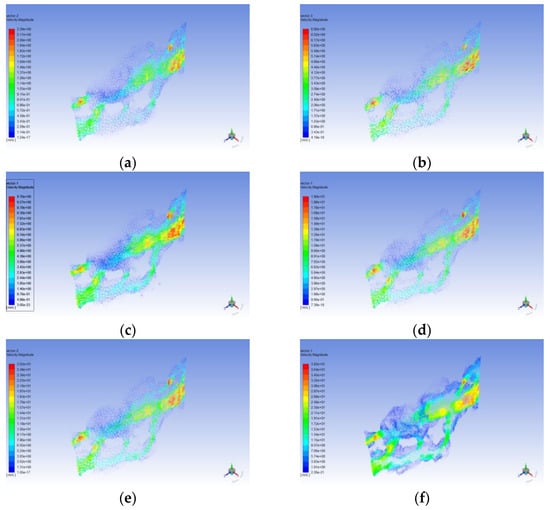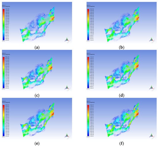 z negative inlet velocity vector diagram:(a) 0.1 Mpa speed vector. (b) 0.5 Mpa speed vector. (c) 1 Mpa speed vector. (d) 3 Mpa speed vector. (e) 5 Mpa speed vector. (f) 10 Mpa speed vector.