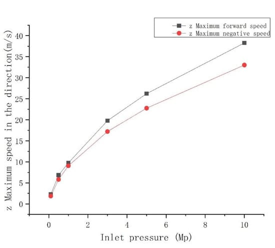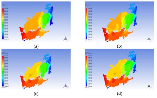 As shown in Figure 3, Figure 4, Figure 5, Figure 6 and Figure 7, the pressure and velocity distributions for the z-positive and z-negative inlet models show that the channel water seepage characteristics are similar in different directions. The overall pressure distribution pattern is similar in both positive and negative directions, with the pressure gradually decreasing along the direction of water seepage and the pressure change showing a trend of first decreasing and then increasing when the fissure channel suddenly becomes larger. The overall trend of velocity change in the positive and negative directions is to decrease and then increase. There is no significant change in the seepage of water in the same direction under different pressure conditions. As the pressure continues to increase, the seepage rate of water continues to increase but eventually tends to a steady state. As shown in Figure 3, Figure 4 and Figure 8, the seepage is approximately the same for the different fracture models under the same pressure conditions.