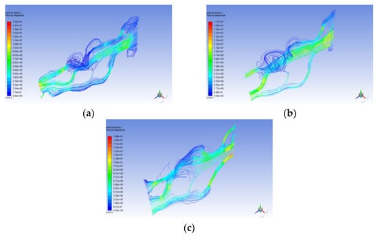 In order to visually observe the matrix loss and skeletal seepage routes within the pore space, the DPM modeling method in FLUENT software was used to set the particles to be injected from the entrance surface and set the boundary to reflective particle type, and then the particles were tracked to show the seepage trajectory of the particles within the pore space in a more intuitive way, and the changes in the flow field could be seen through the particle trajectory in the post-processing. This is shown in Figure 9.