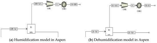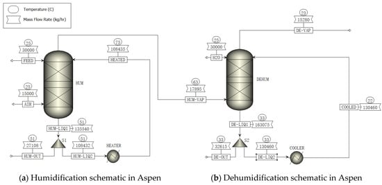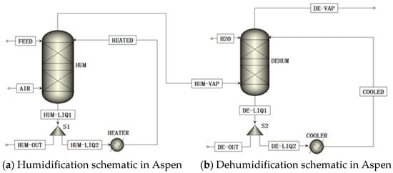 The RadFrac model was used to replicate the humidifier (HUM) and dehumidifier (DEHUM). The humidification process contained two feed streams, wastewater (FEED) and air (AIR), as showed in Figure 1a. The wastewater flowed in the humidifier from the top and the air flowed in from the bottom. After the two feed streams had a counter-current exchange, the separated gas stream (HUM-VAP) left for the dehumidifier, and the concentrated brine (HUM-LIQ) flowed out and split into two streams: 20% of the brine (HUM-OUT) split out of the system and the remaining brine was fed to a heater (HEATER). The heated stream (HEATED) then returned into the humidifier to create a loop.
