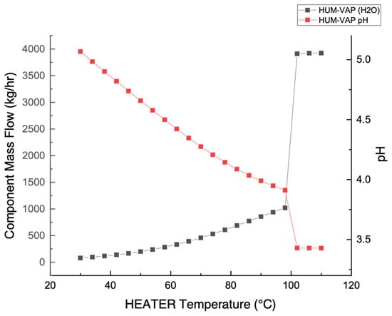 Water vapor mass flow and HUM-VAP stream pH as a function of HEATER temperature.