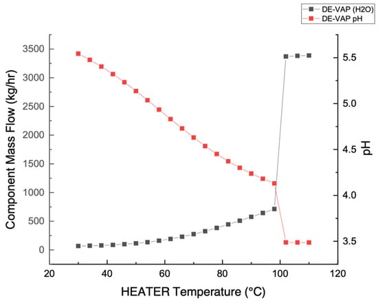 Water vapor mass flow and DE-VAP stream pH as a function of HEATER temperature.
