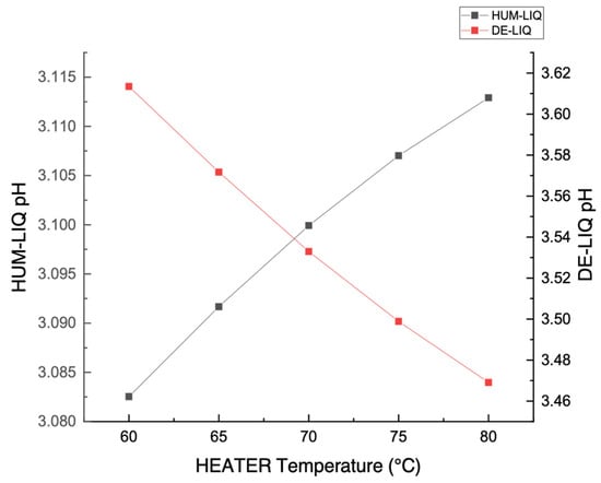 HUM-LIQ pH and DE-LIQ pH as a function of HEATER temperature.