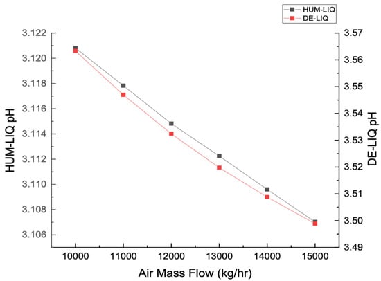 HUM-LIQ pH and DE-LIQ pH as a function of feed air mass flow.