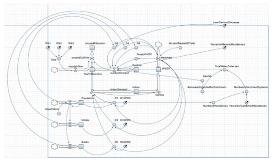 Since its conception in the 1950s [] and with further development [], SD has been applied to a number of topics specific to water, such as illustrating the effects of proposed strategies while raising stakeholder awareness of resource problems []. The appropriateness of SD modeling techniques to address water management concerns specifically was shown by [,,]. Elsawah et al. [] found that SD modeling can be applied to water allocation problems at various scales, with a tendency to use this type of modeling for decision-making and social education. Additionally, Winz et al. [] found that, because it requires explicit acknowledgement of assumptions and identification of uncertainties, SD modeling represents a transparent method that can confidently inform policy recommendations. Finally, Karimlou et al. [] reasoned that SD can help choose the most efficient management strategies by helping managers observe the linked changes occurring in the system.