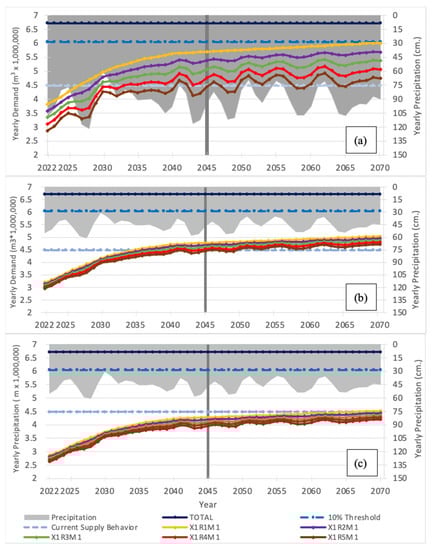 While a 50% reduction in precipitation for the entire simulation period is unlikely to occur, this scenario allows us to study the magnitude of the effects of a meteorological drought at different points in time. Results show that drought conditions manifest a distinct difference from base case conditions (Figure 5b). The spread of the five different combinations shows a smaller relative influence of intervention R (rainwater harvesting), because there is less precipitation available to capture and use as an alternative water supply for irrigation. Thus, during times of drought, when additional water is needed most, rainwater harvesting is less effective. Similar to base case conditions, ranging combinations by interventions X and M have minimal impact. Increasing intervention X from 0% to 5% decreases demand by 0.7%, and intervention M does not reduce demand noticeably at any level of adoption. Increasing adoption of intervention R from 0% to 25% decreases demand by 1.5%; this reduction is less than that seen in the base scenario.