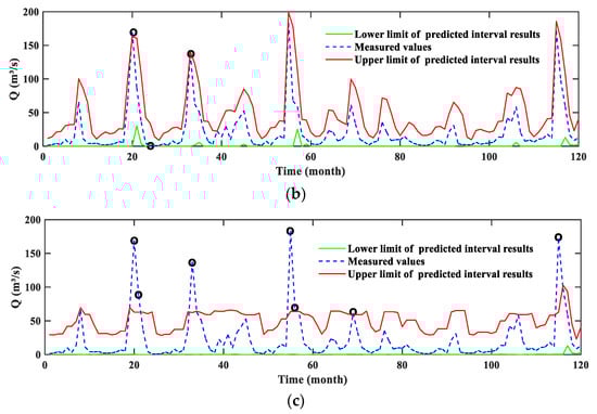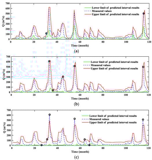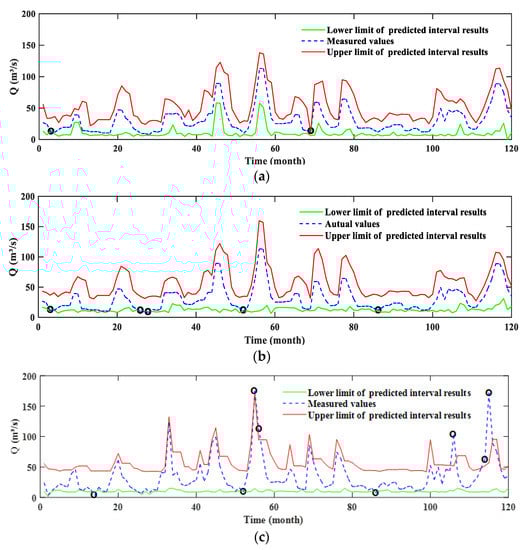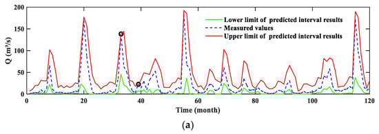 where represents the lower bounds of PI; represents the upper bounds of PI; is the measured runoff.