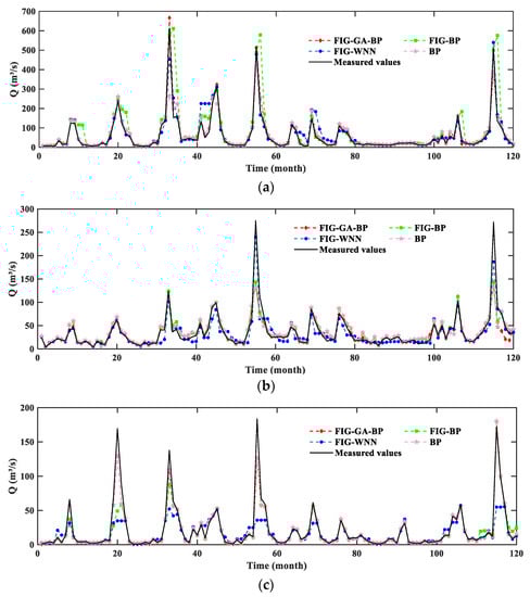 By observing and analyzing Figure 8, we can see that the prediction effects of the three prediction models are good, and the measured values fall into the prediction interval formed by the red line and the green line. It can be observed from Figure 8a that the measured values from two months exceed the upper limit of the prediction interval. In Figure 8b, the predicted value of 2 months exceeds the upper limit of the prediction interval, the measured value of 1 month is lower than the lower limit of the prediction interval, and the measured value of 3 months in total is not in the prediction interval. In Figure 8c, the measured value of 7 months exceeds the upper limit of the prediction interval. Therefore, more points meet the requirements in the prediction results of the FIG-GA-BP model, and the prediction interval range is narrower, indicating that the prediction effect of the FIG-GA-BP model is the best. The lower bound of the prediction results of the FIG-GA-BP model is closer to the measured value. It indicates that the FIG-GA-BP model has better prediction ability when the flow is small. In addition, the prediction accuracy of the FIG-GA-BP model at the mutation point is significantly better than that of the FIG-BP model and the FIG-WNN model, and FIG-WNN has the worst predictive effect at runoff break point. The above analysis shows that the FIG-GA-BP model makes full use of the information contained in the runoff sequence to achieve better prediction effect.