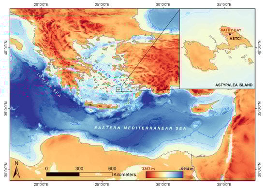 Map of the Eastern Mediterranean region, the location of the study site, and sediment core ASTC1. The bathymetric data were obtained from GEBCO (https://download.gebco.net (accessed on 15 January 2021)).