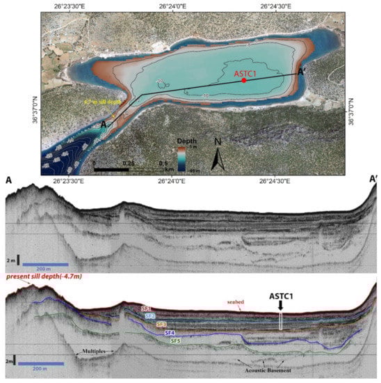 High-resolution seismic data were obtained from the Vathy bay in two phases, in July 2016 and July 2018, with a research vessel specially modified to meet the marine geophysical survey needs. During the first phase, a chirp-type subbottom profiling system with 5–10 cm resolution was used, and a dense network of seismic lines was produced to obtain seismic stratigraphy. The retrieved data helped us reconstruct the seismic stratigraphy of the upper 10 m of sediments below the sea floor and helped to select a favorable coring location where the maximum sedimentary sequences could penetrate. In the second phase, seismic data of higher resolution (1–5 cm) were obtained with a parametric Innomar SES-2000 light plus subbottom profiler to provide more details regarding the inner structure of the sedimentary units that were also recognized in the chirp profiles. During all the phases of the survey, the exact positional data were provided by a Differential Global Positioning System (DGPS) with an accuracy of ±1–2 m. For this study, only the high-resolution seismic profile of the second phase (seismic transect AA’, Figure S1) along the coring site was interpreted and correlated with the sediment core units (Figure 2). This profile is representative of the core site and the area bounded by the core site location and the straits of the bay.