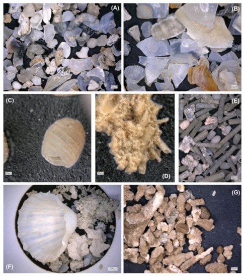 (A,B) mollusc fragments, (C) Gyrogonite (Charophyte oogonial cell), (D) Calcified remains of a charophyte cortex (thalli encrustation), (E) Calcified Charophyte cortex and Gyrogonites, (F) Bivalve (Acanthocardia paucicostata), and carbonate aggregates, (G) Clastic grains and fish bones.