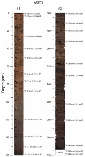 Calendar 14C dates measured along the two sections of the ASTC1 sediment core.