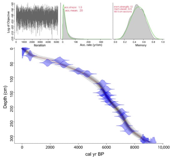 - Blaauw, M.; Christen, J.A. Flexible Paleoclimate Age-Depth Models Using an Autoregressive Gamma Process. Bayesian Anal. 2011, 6, 457–474. [Google Scholar] [CrossRef]