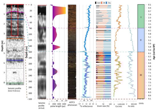 The downcore variations in the above-mentioned proxies (grain size, values of Ca and Fe, and values of b* record) were compared to the pulse length variation retrieved at the core site. An uncertainty of 1–5 cm is implemented by the seismic profile and the extracted pulse length according to the instrument’s specifications; thus, the correlation to the sediment core units is not linear. The comparison showed that lithological units I to III correlate well with seismic facies 1 to 3, respectively, on the seismic profile (Figure 6). The higher amplitude (large pulse length) recorded in SF1 most probably corresponds to the higher density of the sediments of LU-I. In contrast, the fine-grained sediments and the low densities in LU-III correspond to the low pulse length recorded in SF3.