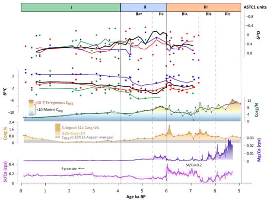 Corg/N ratio varies from 0.6 to 12.4 throughout the ASTC1 record, suggesting a mixed marine/terrigenous type of organic matter [74] for the bigger part of the studied interval (Figure 7). The highest Corg/N values (>10) occur in subunits IIIC, IIIB, and IIB, suggesting a terrestrial organic supply [74,75] for these intervals (9.1–7.3 and 6.1–5.4 ka BP).