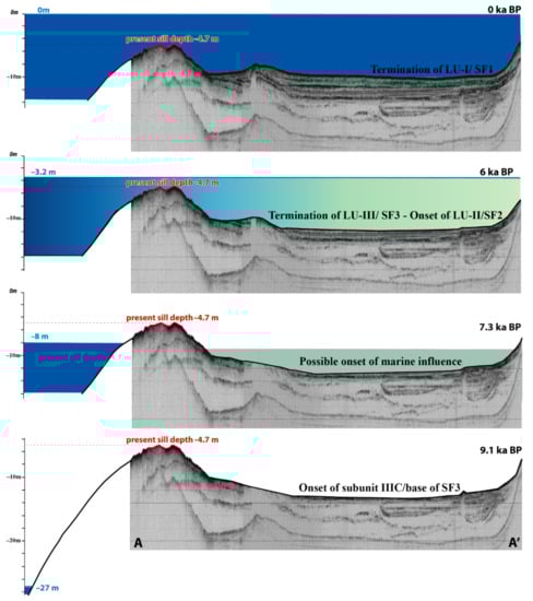 Reconstruction of the different basin phases within the 9.1 ka BP time interval. Each phase represents the lithological unit of the ASTC1 sediment core. Global mean sea level, following Lambeck et al. [23].