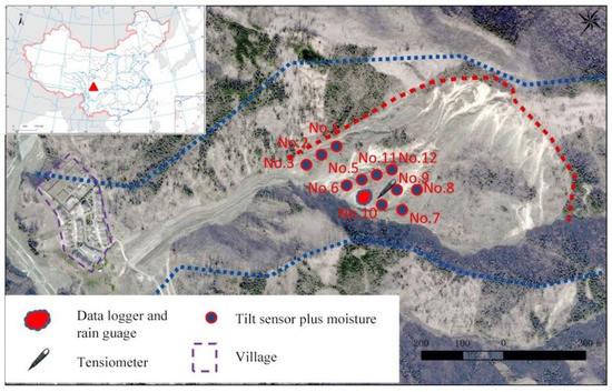 One landslide deposit in the Yindongzi valley was initially triggered by the Wenchuan earthquake (MS. 8.0) on 12 May 2008, after which the deposit was composed with weathered granite, andesitic, and sand, but the fine particles were rare in the deposit. The loose structure of the landslide deposit was easily eroded by rill erosion at the free surface, which occurred after rainfall and souring flows in the hollow of gullies at the edge of the landslide. Soil moisture sensors (Decagon, Pullman, WA, USA) were installed at 50 cm depth (Figure 1) for 12 different locations, and a tipping-bucket rain gauge was installed to collect the actual rainfall data. The soil moisture data measured at other locations were featured with similar patterns in previous studies.