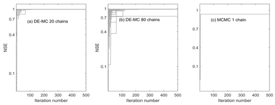 NSE of each iteration step in synthetic experiment: (a) DE-MC 20 chains; (b) DE-MC 80 chains; (c) MCMC 1 chain.