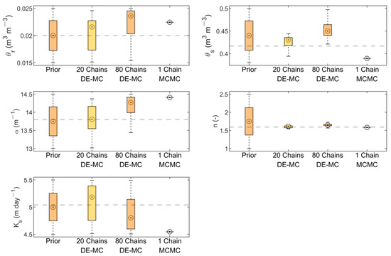 For validating the effectiveness of DE-MC and MCMC algorithms in optimizing the soil hydraulic parameters, the prior and posterior PDF of each soil hydraulic parameters were shown as approximations of boxplot, and the predefined true values were plotted as dash lines (Figure 3). Besides, mean values and standard deviations of prior and posterior PDF of parameters were provided in Table 2. The values of prior parameters (round dots in the first boxplot in each sub figure) were generally consistent with the true parameters, meaning the initial soil hydraulic parameters at the first step were well-defined. The boxplot of posterior parameters was directly compared with the true values and prior PDF for an evolution of the effectiveness of MCMC and DE-MC in finding true soil hydraulic parameters. Besides, if the standard deviation of the posterior PDF reduced to less than half of the prior one, we regarded the magnitude of uncertainty as significantly reduced in the posterior parameters.