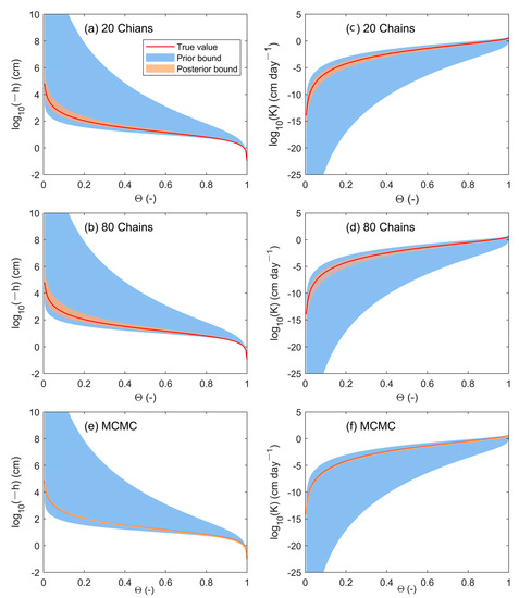 The ensembles of SWCC and HCF described with the prior and posterior soil hydraulic parameters were plotted in Figure 4, covering the low saturation condition ( = 0.005) to near saturated condition ( = 0.995). In Figure 4, the ensemble of parameters selected by MCMC and DE-MC 20 chains and 80 chains were plotted as uncertainty bands, and the true value of soil hydraulic parameters were plotted as solid red lines. For a directly comparison, the ranges of and under three saturation condition (= 0.2, 0.5, 0.8) were shown in Table 3. Normally, the effective saturation of natural soil ranges from 0.2 to 0.8.