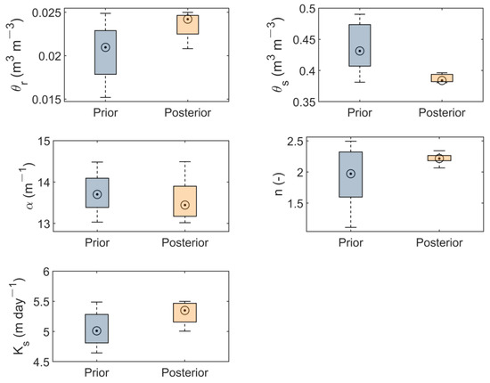 The prior and posterior PDF of soil hydraulic parameters are shown as the boxplot in Figure 7. The comparison of mean values and standard deviation of the prior and posterior soil hydraulic parameters are shown in Table 4.