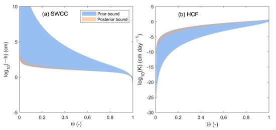 In Figure 8, the ensemble of posterior SWCC is located in the lower part of the prior, meanwhile the posterior HCF is located in the upper part of the prior. This phenomenon can also be found in the posterior and prior value range of and in Table 5. For example, = 0.2, the prior range of was from 1.296 to 7.211 and the posterior range reduced from 1.350~1.607, which indicated a relatively weaker water storage capability of posterior parameters than the prior. Besides, under the low saturation condition, the posterior range of was reduced from −3.216 to −2.509 in comparison with the prior range (−8.435~−2.383). The value ranges of posterior parameters were consistently reduced in comparison with the prior, which indicated the DE-MC reduced the uncertainties in the soil hydraulic properties, and meanwhile described a relatively coarser soil texture in the posterior soil hydraulic parameters than the prior ranges.