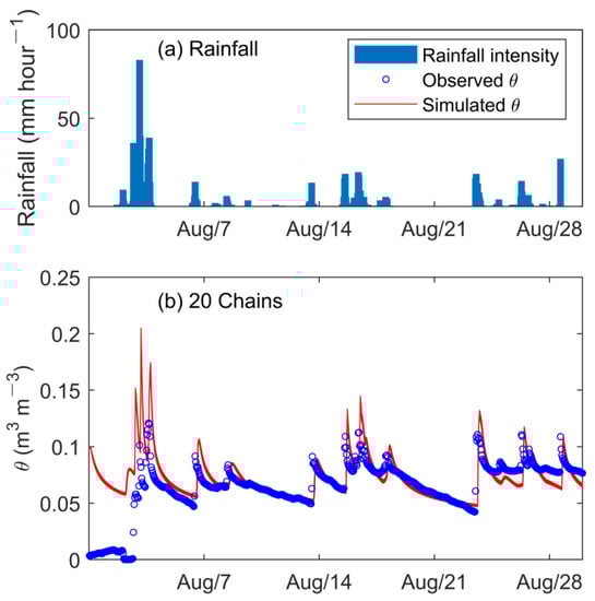 Figure 5 showed both synthetic and simulated soil moisture dynamics in the synthetic example. The true soil moisture dynamics were obtained based on the numerical simulation using the predefined true soil hydraulic parameter. Under the implemented rainfall, soil moisture dynamics clearly showed three major stages. The first stage was from 1 to 14 August with relatively high intensity rainfall (peak intensity was around 83 mm/h) implemented on 4 August, under which the soil moisture experienced a significant fluctuation from 0.088 to 0.283. During the second and third rainfall stages (14~23 August 23~30 August), the highest intensities of peak rainfall were all lower than 27 mm/h, and the true soil moisture content was characterized with small variations between 0.087~0.213.