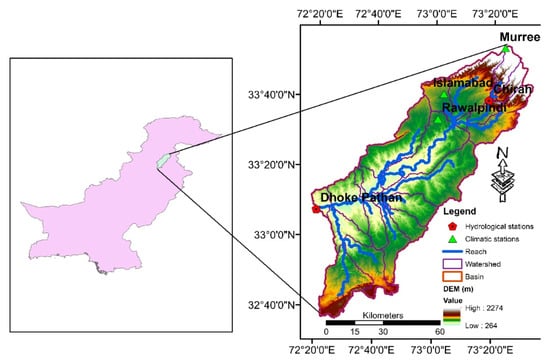 The Soan River is a major tributary of the Indus River and a substantial supplier of water for the Pothwar regions of Pakistan []. It begins in Murree mountains and passes through two hydrological stations of Chirrah and Dhok Pathan before flowing into the Indus River. The SRB covers an area of 6842 km2 with maximum height of 2274 m. The average annual temperature in the SRB varies between 8–18 °C with average annual precipitation of 1465 mm. The northern area of the SRB has humid and sub humid climates whereas southern area has arid and semiarid climates []. Simly dam is also a major supplier of water for the capital city (Islamabad) that receive water from the SRB. Furthermore, the SRB significantly contributes to Pothwar’s agriculture and domestic water use. The slope of the SRB varies from gentle to steep, and monsoon season generates the majority of the stream flow. The study area’s population has grown dramatically in recent years owing to an increase in rural-to-urban migration, suggesting that water supplies are under persistent pressure [].