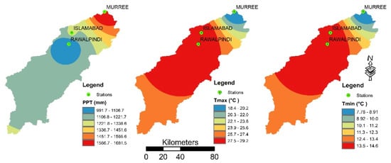The study employed climatic data obtained from the Pakistan Meteorological Department and Soil and Water Conservation Research Institute for three meteorological stations, as shown in Figure 1, for the period of 1991–2017. The climatic data was obtained in terms of temperature, relative humidity, precipitation, wind speed, and solar radiation. The precipitation and temperature data are shown in Figure 2. However, the relative humidity, wind speed, and solar radiation data is available in Appendix A (Figure A1 and Figure A2). Stream flow data (gauged data) was collected from a hydrological station (Chirrah) of Water and Power Development Authority (WAPDA) only for the period of 2006–2013 due to the non-availability of long-term data.