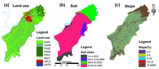 (a) map of land use, (b) map of soil, and (c) slop map of the SRB.