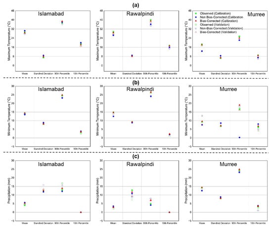Statistical analysis (mean, standard deviation, 90th percentile, and 10th percentile) of (a) maximum temperature (), (b) minimum temperature (), and (c) precipitations for Rawalpindi, Islamabad, and Murree station. Red, green, and blue colors represent bias corrected, observed, and non-bias corrected data points, respectively. Filled, and hollow points represent statistical sign through standardization and authentication periods, respectively.