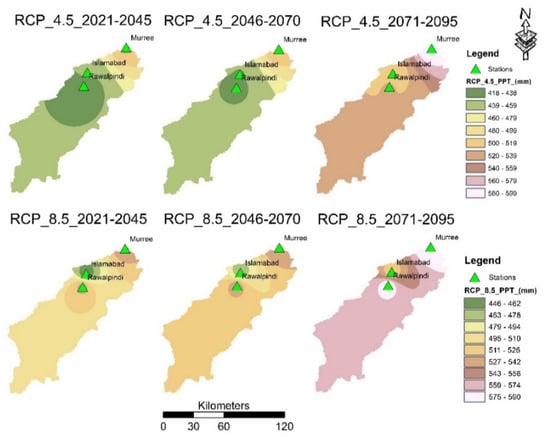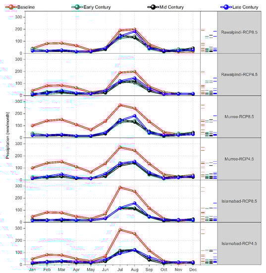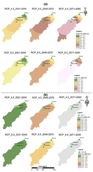 Consequently, in the case of Islamabad, the of 42.5 °C was observed in the month of June for the late century under RCP-8.5 which is 3.5 °C or 26% greater as compared to the baseline period of 38 °C while of 42.5 °C was observed in the same period under RCP-4.5. However, in early and mid-century, under RCP-8.5 was approximately equal to the temperatures under RCP-4.5. According to Figure 6b, the highest values of were in the month of July for all time periods and stations under both emission scenarios. In the case of Islamabad, highest value of of 28.5 °C was observed in the late century for the month of July as compared to the baseline period of 24 °C under RCP-8.5 while according to RCP-4.5, the highest value of of 27 °C was observed.