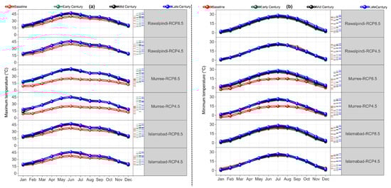 Monthly (a) maximum temperature () and (b) minimum temperature () profiles of different cities (Islamabad, Rawalpindi, and Murree) with their climate stations (RCP-4.5 and RCP-8.5) for time period of baseline, early, mid, and late century.