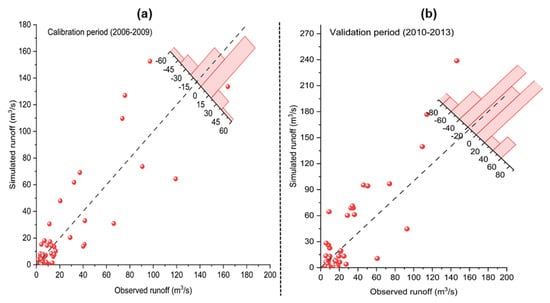 Simulated vs observed runoff for (a) calibration (2006–2009) and (b) validation (2010–2013) periods on monthly basis. The histogram shows difference of simulated and observed runoff values.