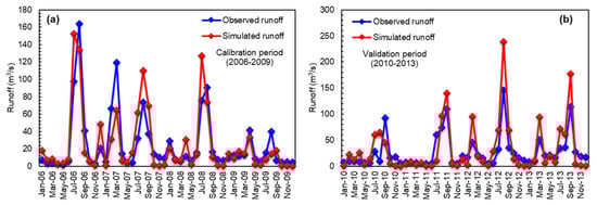 Profiles of simulated and observed runoff (monthly basis) at the SRB throughout (a) calibration period, and (b) validation period.