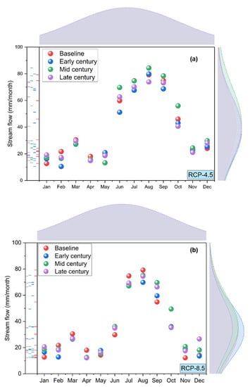 Figure 11 shows monthly changes in stream flows for the baseline to late century with their marginal distribution curves in the SRB under both RCP 4.5 and RCP 8.5. The predicted monthly stream flows were observed at a maximum of 84.34 mm/month and 78.41 mm/month from July to August under RCP-4.5 as shown in Figure 11a while 67.12 mm/month and 75.25 mm/month under RCP-8.5 as shown in Figure 11b in the mid-century period for selected stations. It is important to mention here that the marginal distribution curve in Figure 11 shows a data height in numbers instead of density or relative frequency of data. Additionally, in mid-century, the predicted annual averaged stream flows were observed at a maximum of 42.31 mm and 35.71 mm under RCP-4.5 and RCP-8.5, respectively. The significant difference was observed in peak runoff established in the late century under both emission scenarios. At all meteorological stations, the trend of mean monthly precipitation was directly related to the trend of stream flow.