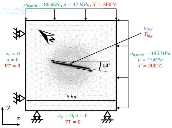 The model is a horizontal section of the reservoir, with the pressure, stress and temperature boundary conditions included in Figure 1. The 2D model domain is a square of 5 km side, with a strike-slip fault of 2000 m length deviated 10 from the x-axis. The direction of the x-axis corresponds to the maximum principal stress , and the y-axis corresponds to that of the minimum principal stress . The fault orientation corresponds to the main direction of seismic events in Basel [16]. The injection well is a 5 m radius circle located 50 m away from the midpoint of the fault.