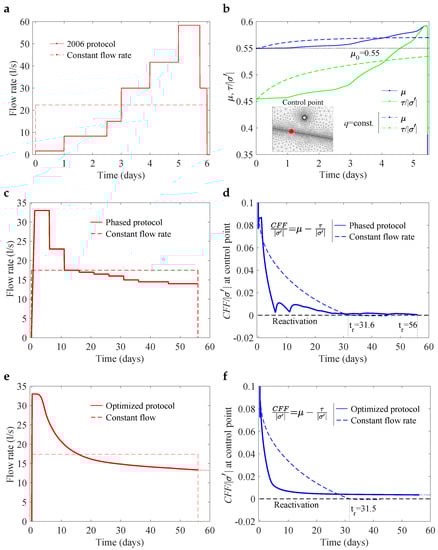 In Figure 2c,e the injection protocols have similar durations and injection volumes. The phased protocol and the optimized protocol have a similar change in the . Nevertheless, the former protocol produces the reactivation after 56 days of injection, while the latter protocol avoids the reactivation and maintains a safety margin ( in Figure 2f). In both cases, the injection at a constant flow rate produces the reactivation of the fault at a similar time.