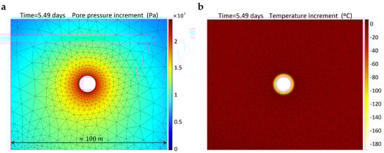 Results of the pore pressure increase (a) and the temperature increase (b) around the injection well at the moment of fault reactivation in the model. We show how the cooling caused by the injection has hardly spread around the well, contrary to what happens with the pressure, which spreads to areas further away from the well.